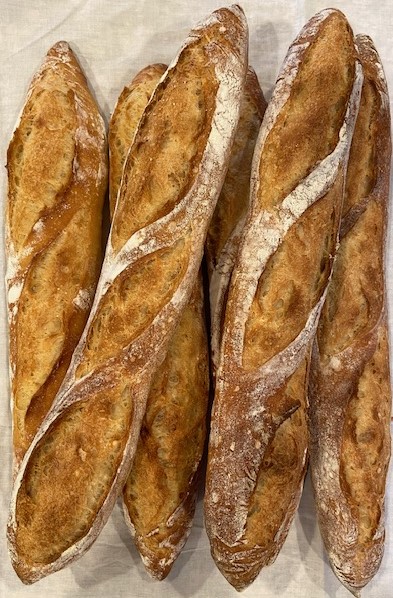 This is a classic favorite and versatile loaf with just the right amount of crunch on the crust and a soft tender inside. Made with white flour and a bit of whole grain wheat.
