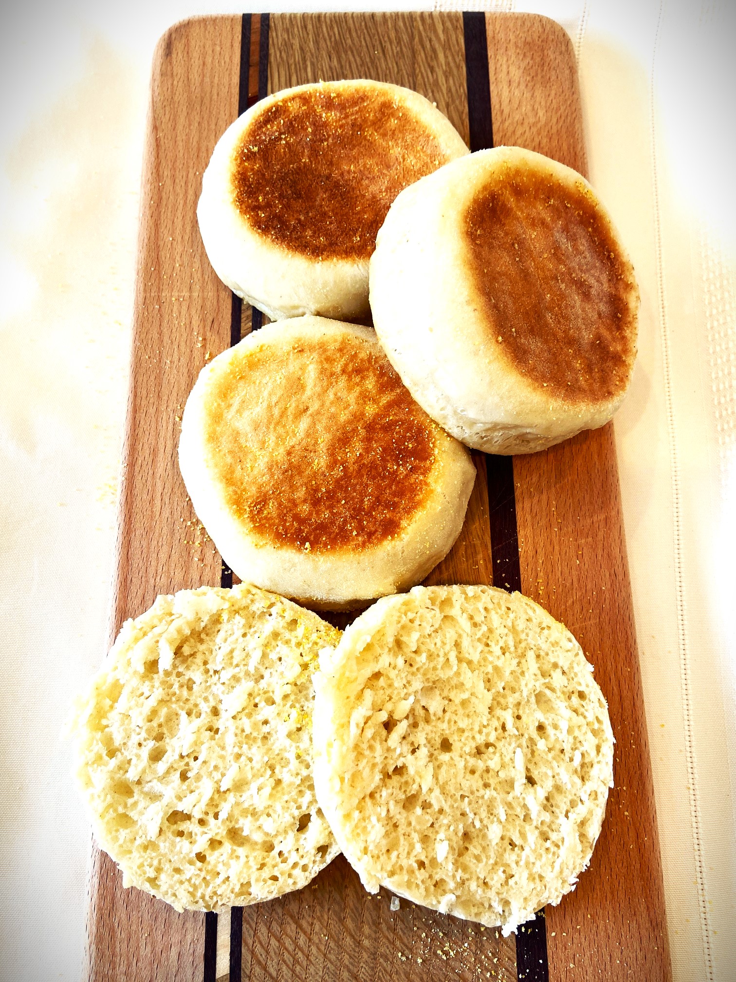 This is no store bought English muffin! It is a light and fresh version that is soft and fluffy inside with a hint of sourdough taste. Makes a great breakfast sandwich – egg, cheese, Canadian bacon.