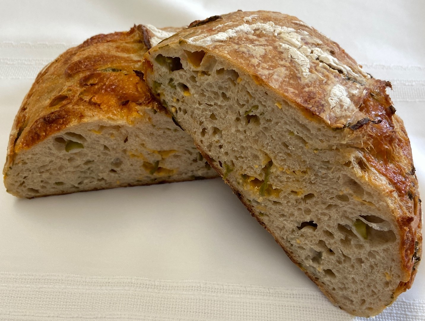 A cheddar cheese lover’s delight with just the right amount of kick from the sliced jalapenos. Try with a Mexican themed salad or creamy soup, or with eggs for breakfast.
